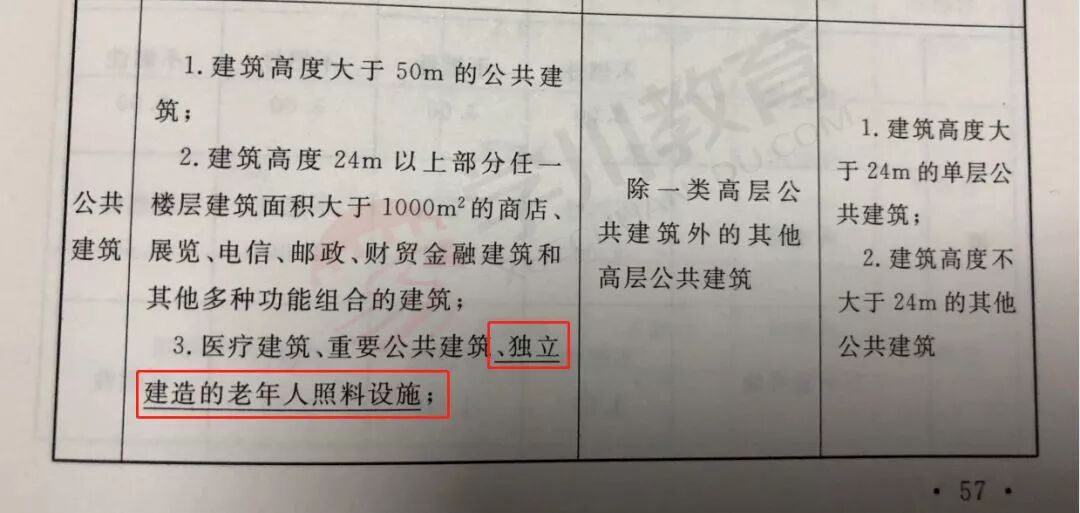 注:独立建造的高层老年人照料设施划分为一类高层。本规范条文中的“老年人照料设施”是指现行行业标准《老年人照料设施建筑设计标准》JGJ450-2018中床位总数(可容纳老年人总数)大于或等于20床(人),为老年人提供集中照料服务的公共建筑,包括老年人全日照料设施和老年人日间照料设施。其他专供老年人使用的、非集中照料的设施或场所,如老年大学、老年活动中心等不属于老年人照料设施 。本规范条文中的“老年人照料设施”包括3种形式,即独立建造的、与其他建筑组合建造的和设置在其他建筑内的老年人照料设施。